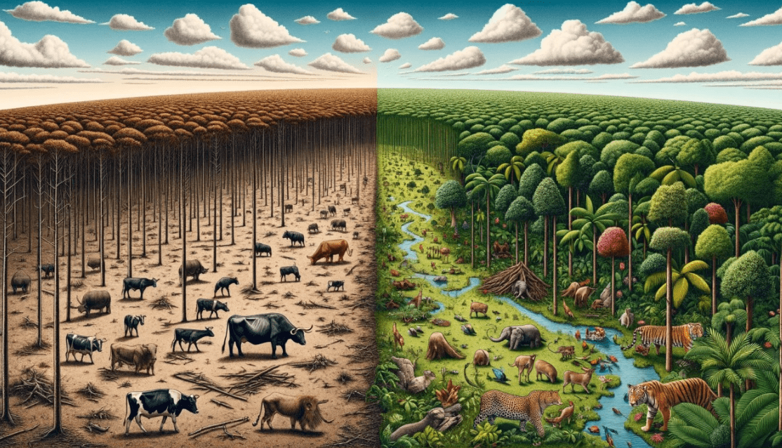 حیوانات وحشی و گیاهان بسیاری به دلیل گسترش مراتع دامداری یا کشت علوفههای صنعتی از زیستگاههای طبیعیشان رانده شدهاند. این تخریب تنوع زیستی را کاهش داده و به کاهش پایداری اکوسیستمها منجر میشود.